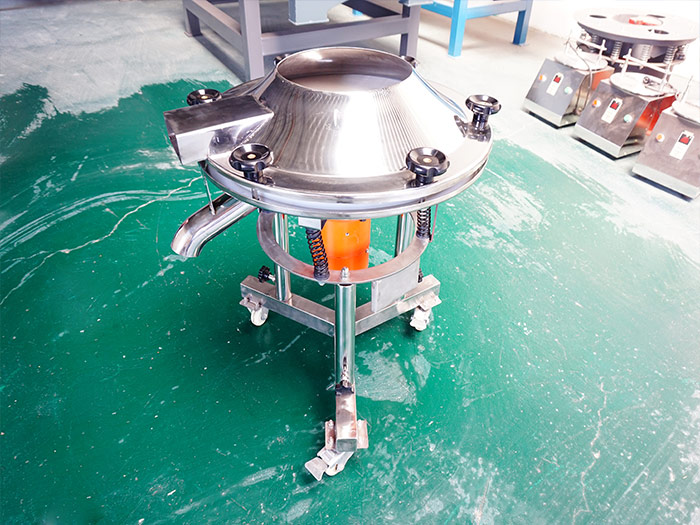 450過濾篩——直徑為450mm,由電機(jī)驅(qū)動(dòng)重錘激振,篩體產(chǎn)生水平、垂直、傾斜的三次元運(yùn)動(dòng),使含水物料在篩網(wǎng)上被拋起并由中央向外旋轉(zhuǎn)擴(kuò)散到出料口排出,含水物料在篩網(wǎng)上面的運(yùn)動(dòng)中,細(xì)小顆?;蛞后w透過篩網(wǎng),通過選擇安裝相應(yīng)的篩網(wǎng)和篩網(wǎng)層數(shù)使物料完成篩選分級(jí)或過濾,分選出的物料由各自的出料口分別自動(dòng)排出。是一臺(tái)單層篩分和過濾使用的振動(dòng)篩,被各個(gè)廠家和用戶叫做液體專用振動(dòng)篩,因?yàn)闄C(jī)身小的原因,所以它的處理量不多,適用于小產(chǎn)能要求。