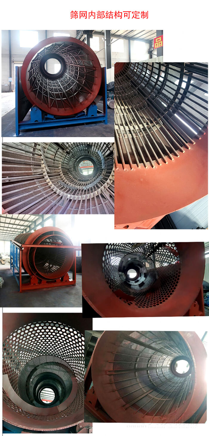 重型滾筒篩的結構相對簡單,主要由滾筒裝置、電動機、減速機和篩網等組成。滾筒裝置傾斜安裝于機架上,電動機通過減速機與滾筒裝置連接,驅動滾筒繞其軸線轉動