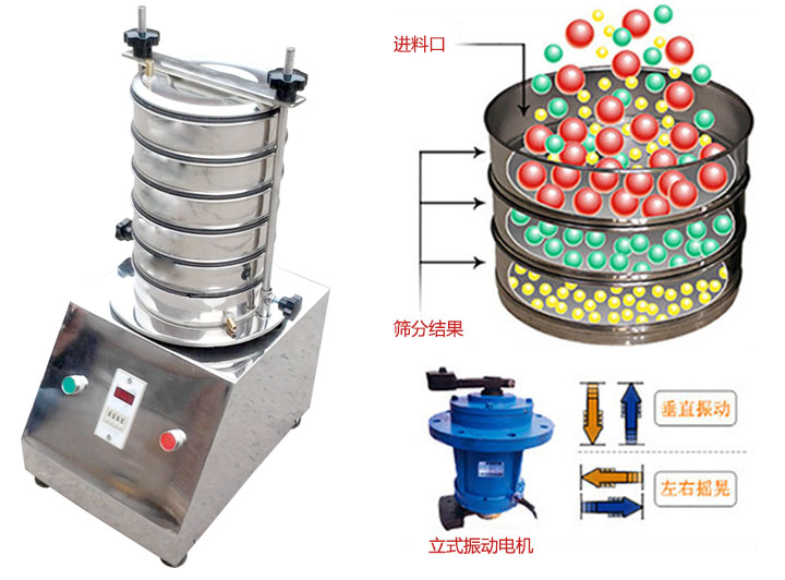 準試驗篩是以YZU立式振動電機作為整機振動源,通過振動電機帶動上部振動盤振動,再通過振動盤傳導至安放在振動盤上部Φ200篩框上,然后由需要檢測目數(shù)的篩框把小于篩面網(wǎng)孔的物料顆粒篩分至下層篩框,如此層層篩選,使每層試驗篩內(nèi)只留相同粒度的物料,達到不同粒度的分離并確定此物料的粒度組成,使Φ200型篩框中的物料能非常有效的起到過濾、分級、篩分目的。